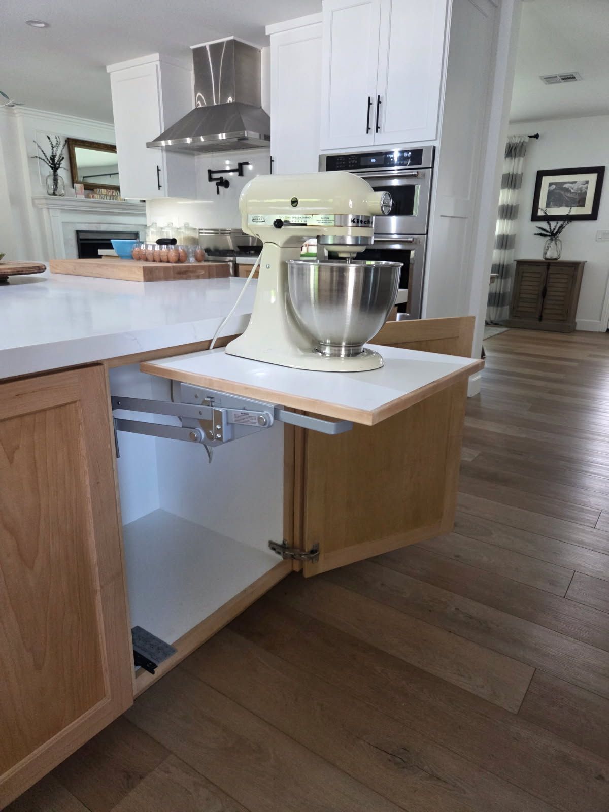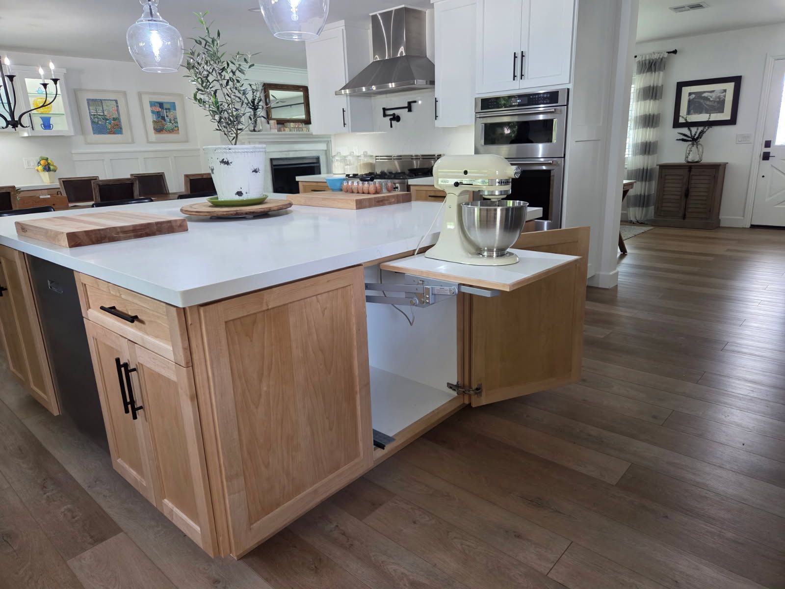 Six foot by eight foot island with pot drawers appliance lift dishwasher and storage pullouts.