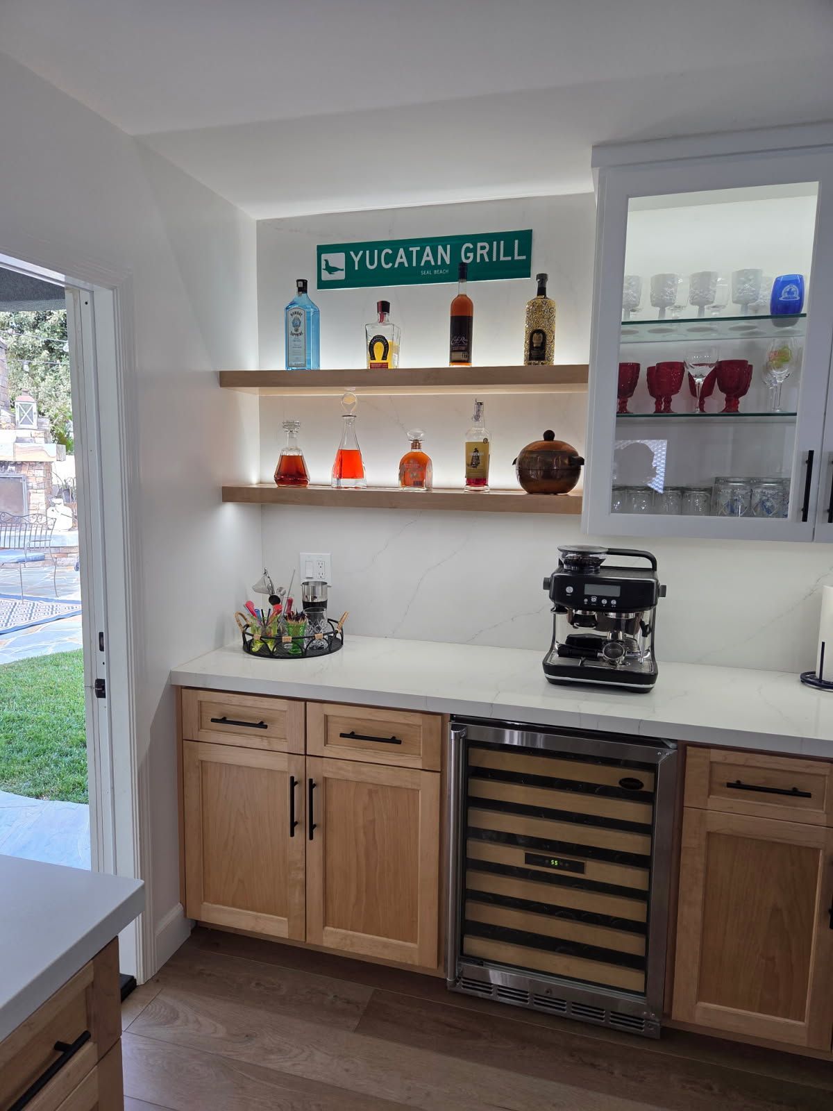 Custom sink wall with little floating shelves, more wine storage and uppers with undercounter lighting and uppers with glass doors and interior lighting.